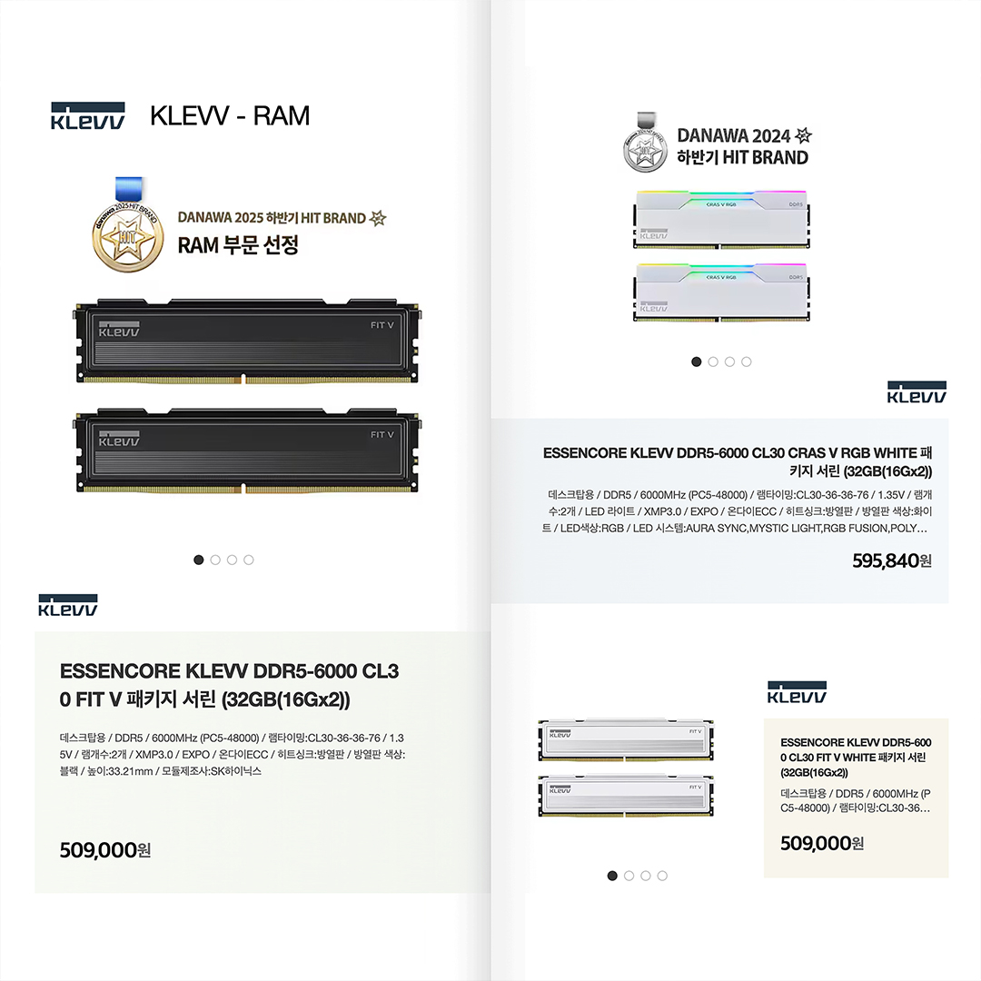 KLEVV 榮獲韓國「Danawa 2025 2H Hit Brand」記憶體殊榮 Update 15 Dec, 2025 KLEVV 再次寫下品牌發展的重要里程碑。 KLEVV 記憶體產品再次獲得韓國指標性比價平台 Danawa 頒發的 「Danawa 2025 2H Hit Brand」獎項(RAM 類別),展現 KLEVV 在韓國市場的高度品牌認同與良好口碑。 此項殊榮不僅反映消費者對 KLEVV 產品品質與效能的持續信任,也突顯當地代理商 Seorin 長期投入與努力,為品牌在市場上的穩健成長奠定重要基礎。 • 獲獎產品: ESSENCORE KLEVV DDR5-6000 CL30 FIT V BLACK • 獲獎品牌: KLEVV 這項肯定對整個團隊而言是莫大的鼓舞。我們將持續以此為動力,深化各市場布局,並期許在未來取得更多正面成果。 === • Danawa 2025 2H Hit Brand 官方頁面(KLEVV RAM) -活動連結: https://event.danawa.com/hitbrand/list.php?hitBrandId=25hitbrand2&cate1=704&cate2=2499 -活動影片: https://youtu.be/B3KRGHVkqNQ • 所有榮獲「Hit Brand」獎項的品牌,皆於 Danawa 官網上獲得重點曝光