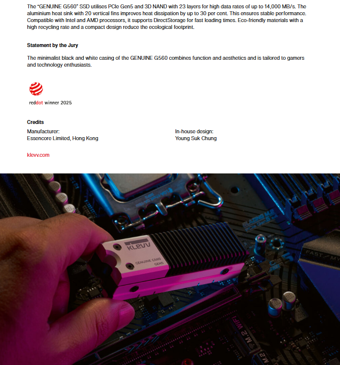 KLEVV GENUINE G560 榮獲 2025 年德國紅點設計大獎! Update 08 Apr, 2025 好消息分享! 我們很榮幸地宣布一則好消息:KLEVV 旗下高階產品 GENUINE G560 Gen5 SSD 榮獲享譽國際的 2025 年德國紅點設計大獎! 這項殊榮由專業評審團隊評選,充分肯定了我們在尖端技術與精緻美學設計上的堅持與努力。 我們為此重要成就感到振奮,並將持續以創新為核心,重新定義遊戲與高效能儲存的未來。 得獎詳情: ➢ GENUINE G560: https://www.red-dot.org/project/genuine-g560-82481