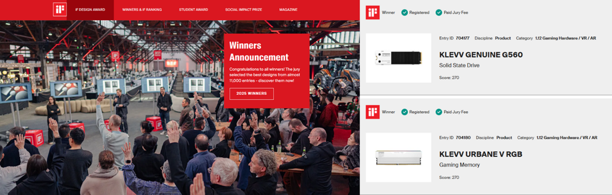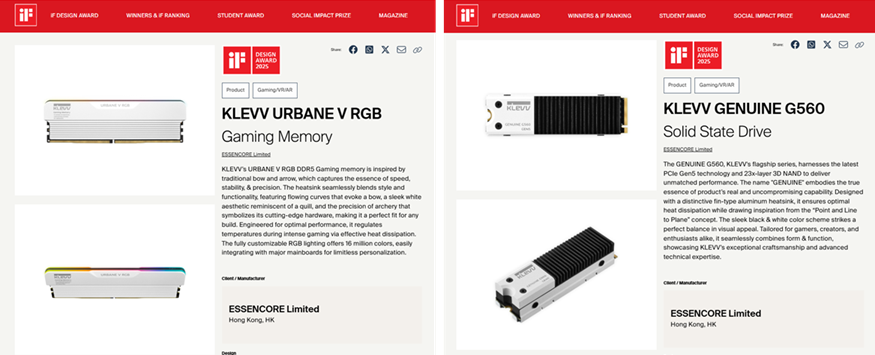 KLEVV RAM & SSD 雙雙獲頒 2025 年德國 iF 設計獎 Update 25 Mar, 2025 Essencore 欣然宣布,我們最新推出的高階 DDR5 電競/超頻記憶體與 SSD,KLEVV URBANE V RGB Gaming/OC 記憶體 以及 GENUINE G560 Gen5 SSD,雙雙榮獲享譽國際的 2025 年 iF 設計大獎!🏆 這項殊榮由 131 位 iF Design 獨立設計專家評選,再次彰顯了我們在創新、高效能與前衛美學上的堅持與承諾。 在迎來這個重要里程碑的同時,KLEVV 團隊也將持續突破界限,為全球帶來更多創新且令人期待的產品。 得獎詳情: ➢ URBANE V RGB: https://ifdesign.com/en/winner-ranking/project/klevv-urbane-v-rgb/704180 ➢ GENUINE G560: https://ifdesign.com/en/winner-ranking/project/klevv-genuine-g560/704177 產品亮點: ➢ URBANE V RGB: KLEVV URBANE V RGB DDR5 電競記憶體的設計靈感源自傳統弓箭,展現速度、穩定與精準的精髓。其散熱片完美融合美學與功能性,流暢的弧線呼應弓身、純白外觀宛如羽箭,而精準的細節則象徵尖端硬體的實力,使其成為任何電腦組裝的理想選擇。 為了實現最佳效能,產品具備高效散熱設計,能在激烈遊戲過程中有效控溫。搭載可完全自訂的 RGB 燈效,提供高達 1,600 萬種色彩,並可輕鬆整合主流主機板,帶來無限個人化可能。 ➢ GENUINE G560: KLEVV 旗艦系列 GENUINE G560 採用最新 PCIe Gen5 技術與 232 層 3D NAND,展現無與倫比的強大效能。「GENUINE」之名象徵產品真實且毫不妥協的實力。 產品搭載獨特的鰭片式鋁製散熱片,具備卓越的散熱效能,其設計靈感來自「點•線•面」的概念。黑白相間的俐落配色,完美呈現視覺平衡。 GENUINE G560 專為玩家、創作者與進階使用者打造,將外觀設計與功能表現完美結合,充分展現 KLEVV 的精湛工藝與先進技術實力。